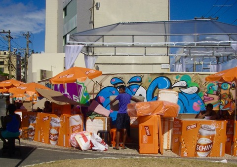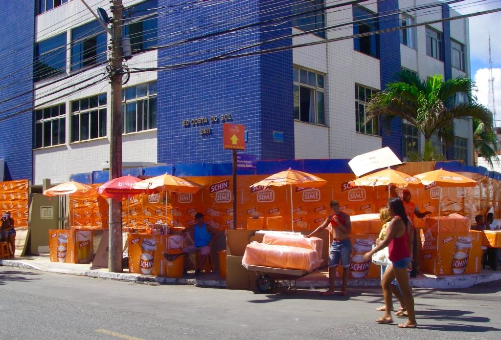 トラックや手押し車で、大量のビールと水が運び込まれてます。
